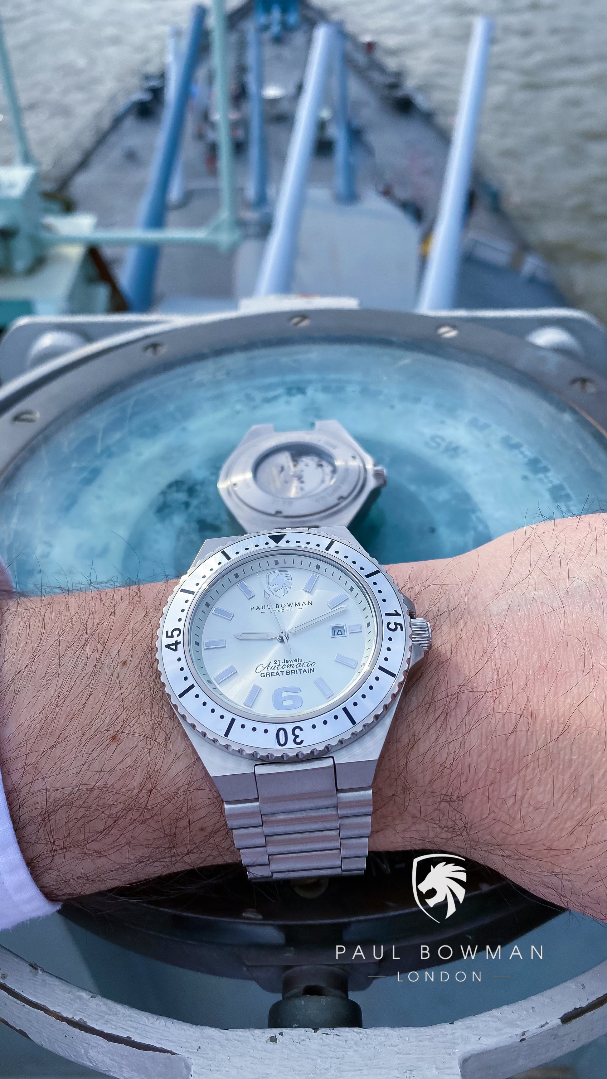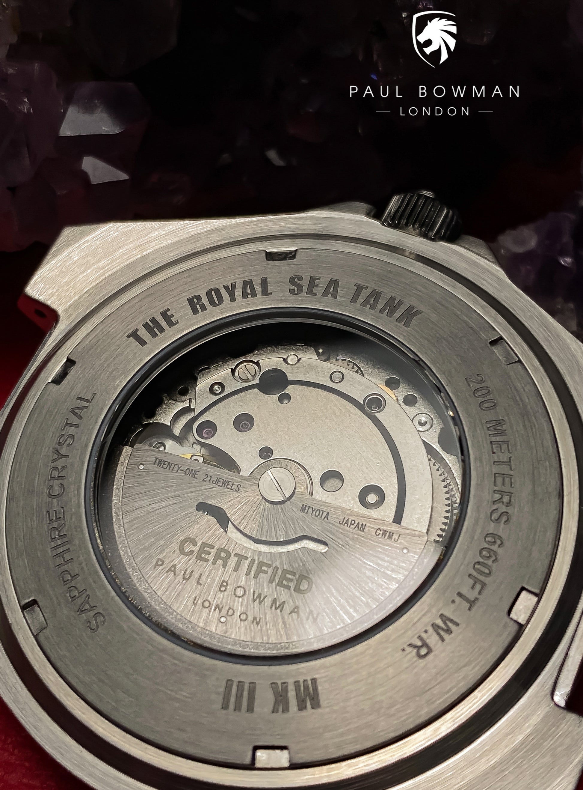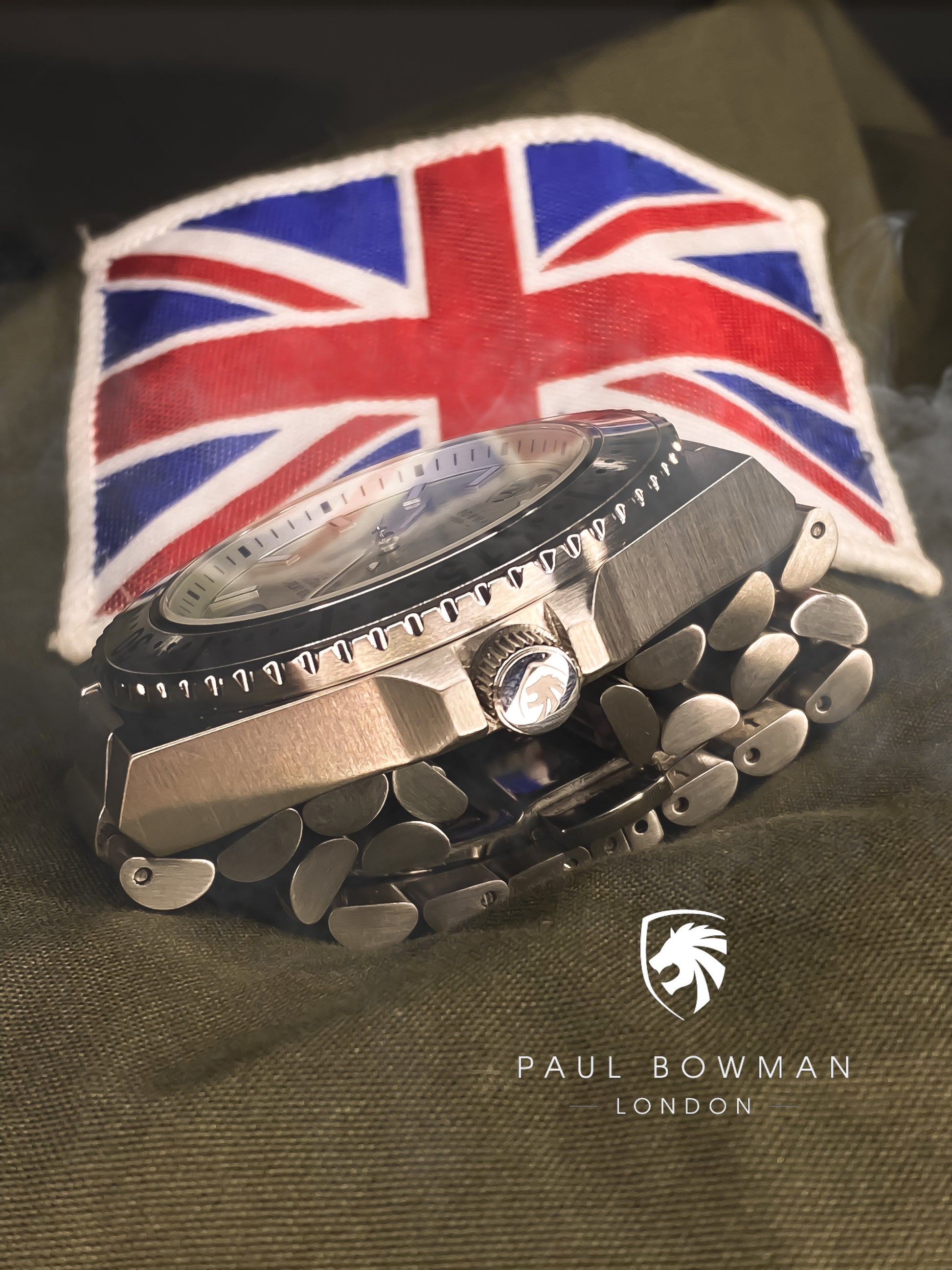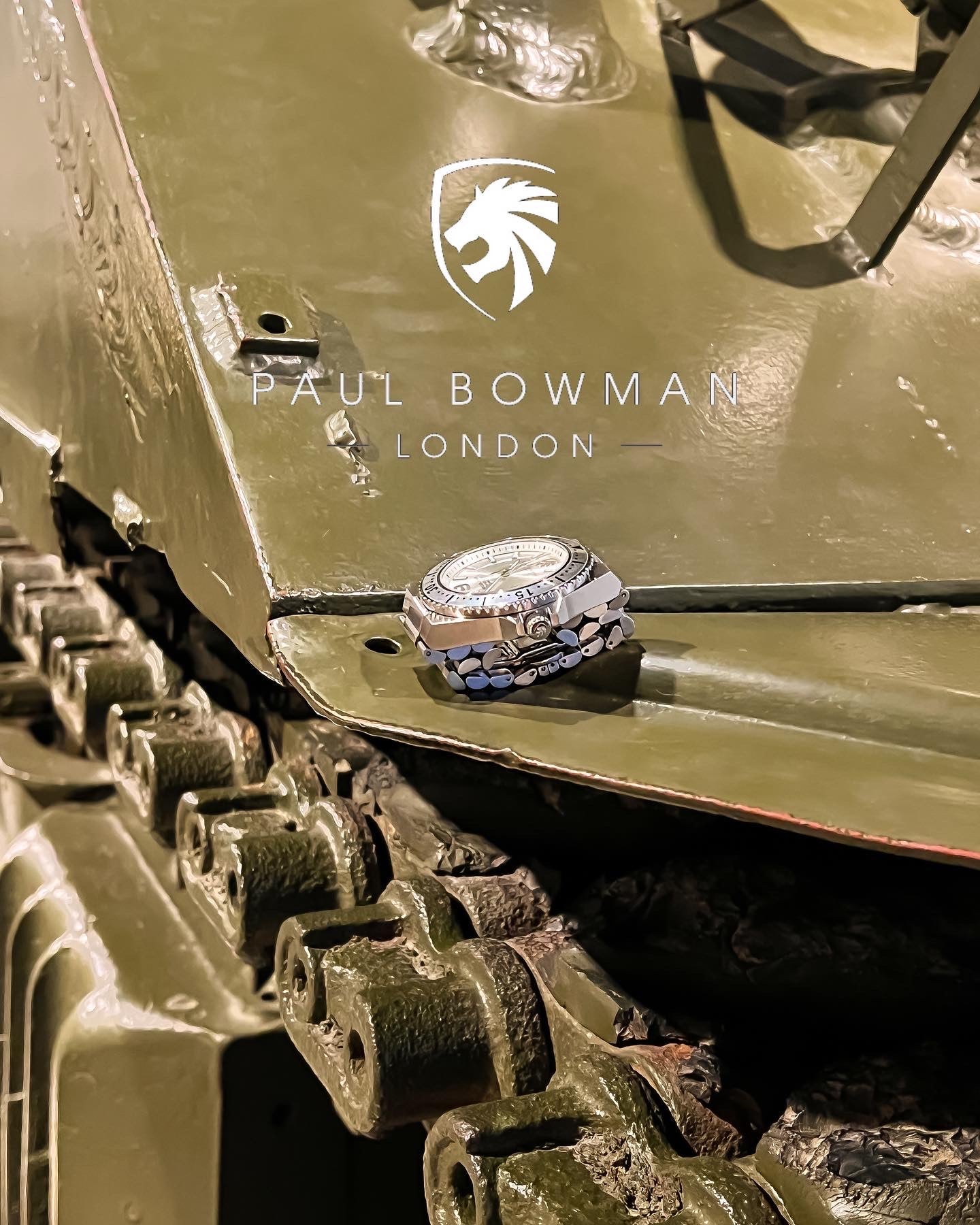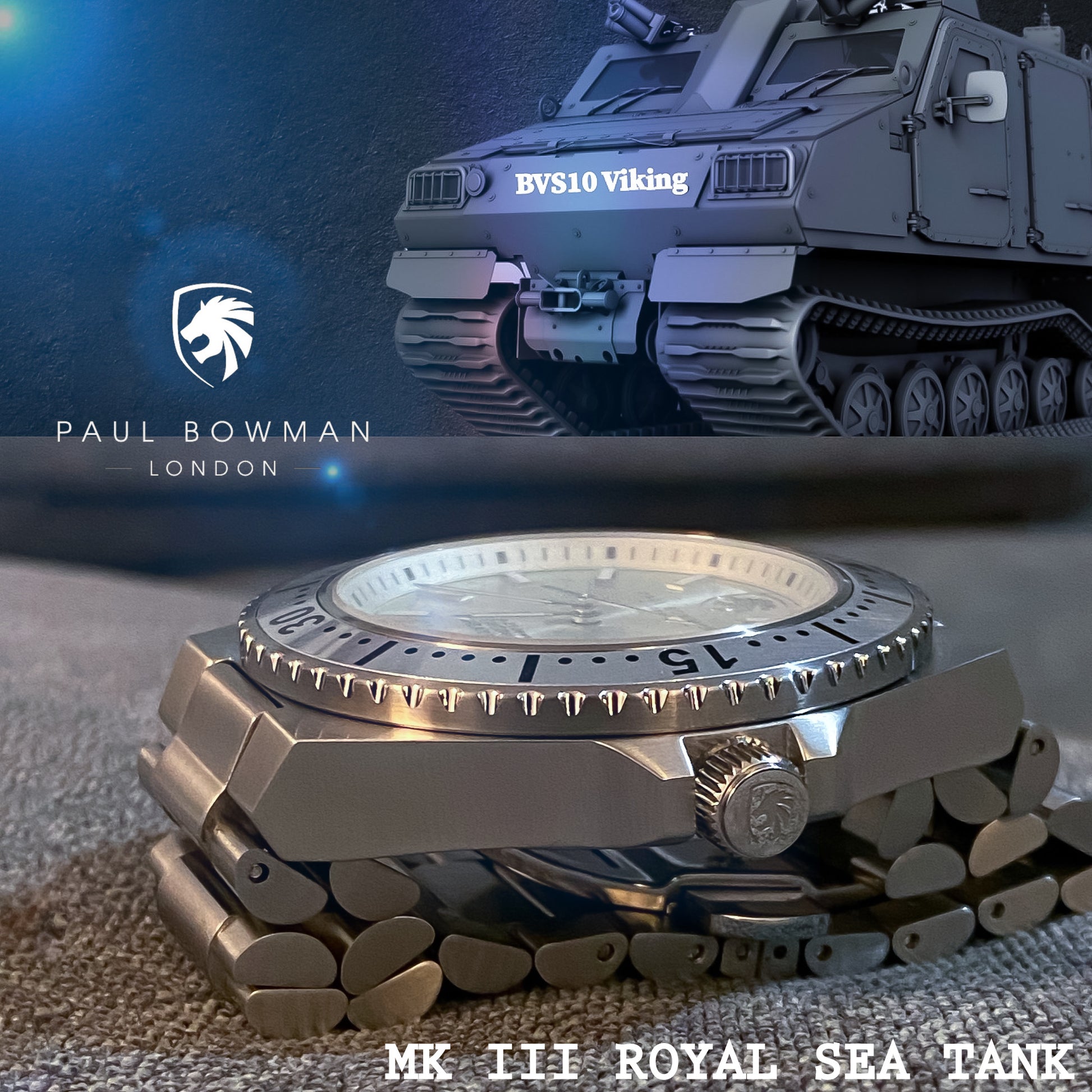 Paul Bowman London proudly introduce its new Maritime range, The Royal Sea Tank MKIII, which is an incredibly tough, robust and very accurate timepiece, heavily built to last. But with all that toughness also comes with exquisite elegance, extremely comfortable, features a Sunburst light grey metallic dial, Sapphire crystal, 21 jewels Japan automatic movement and 200 meters of water resistance, will seat proudly on your wrist with commanding presence inspired on the Royal Navy Viking (BvS10) fully-amphibious vehicle.