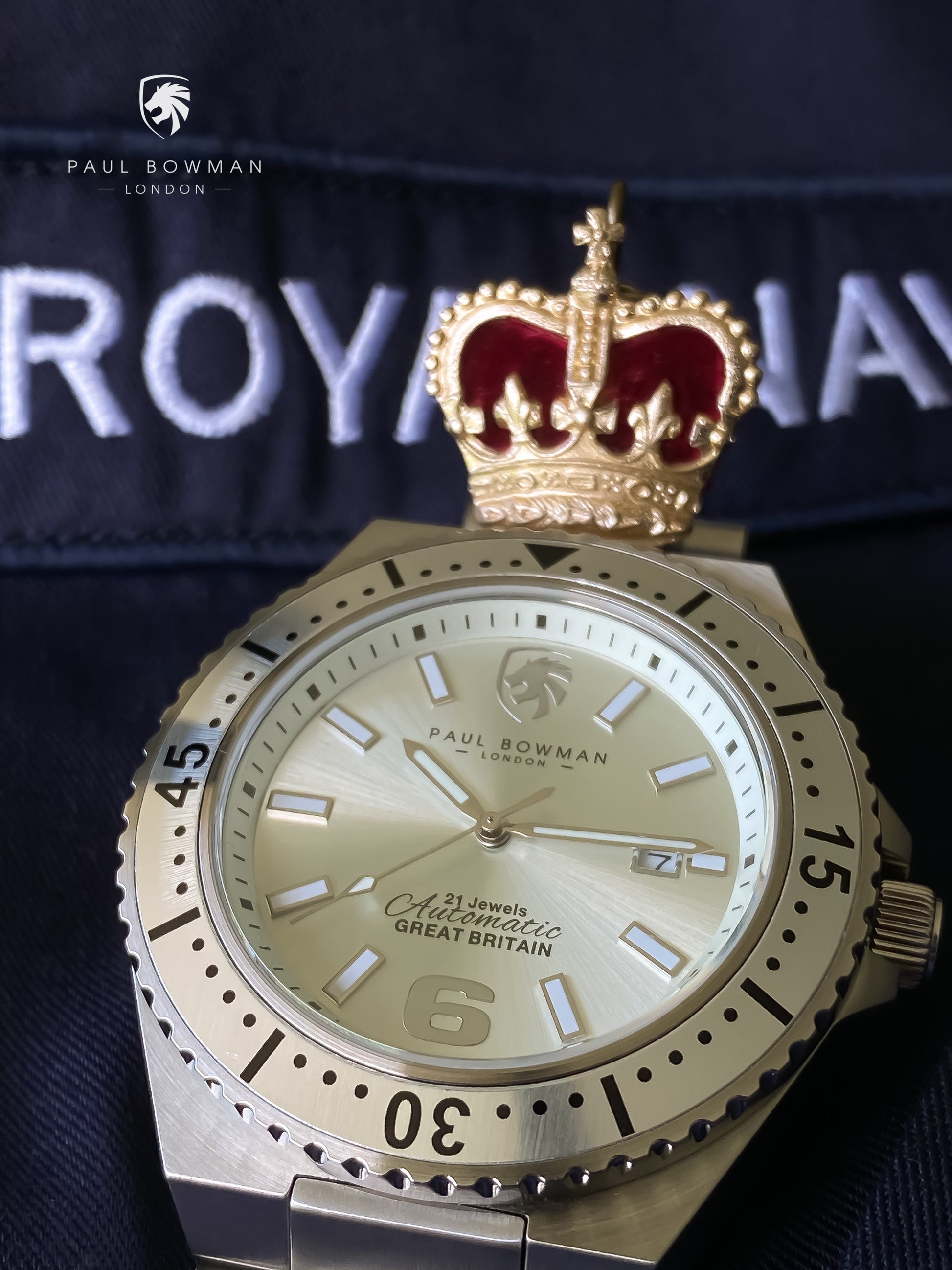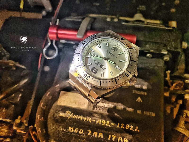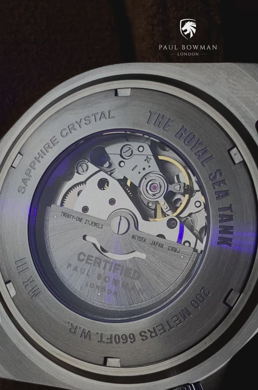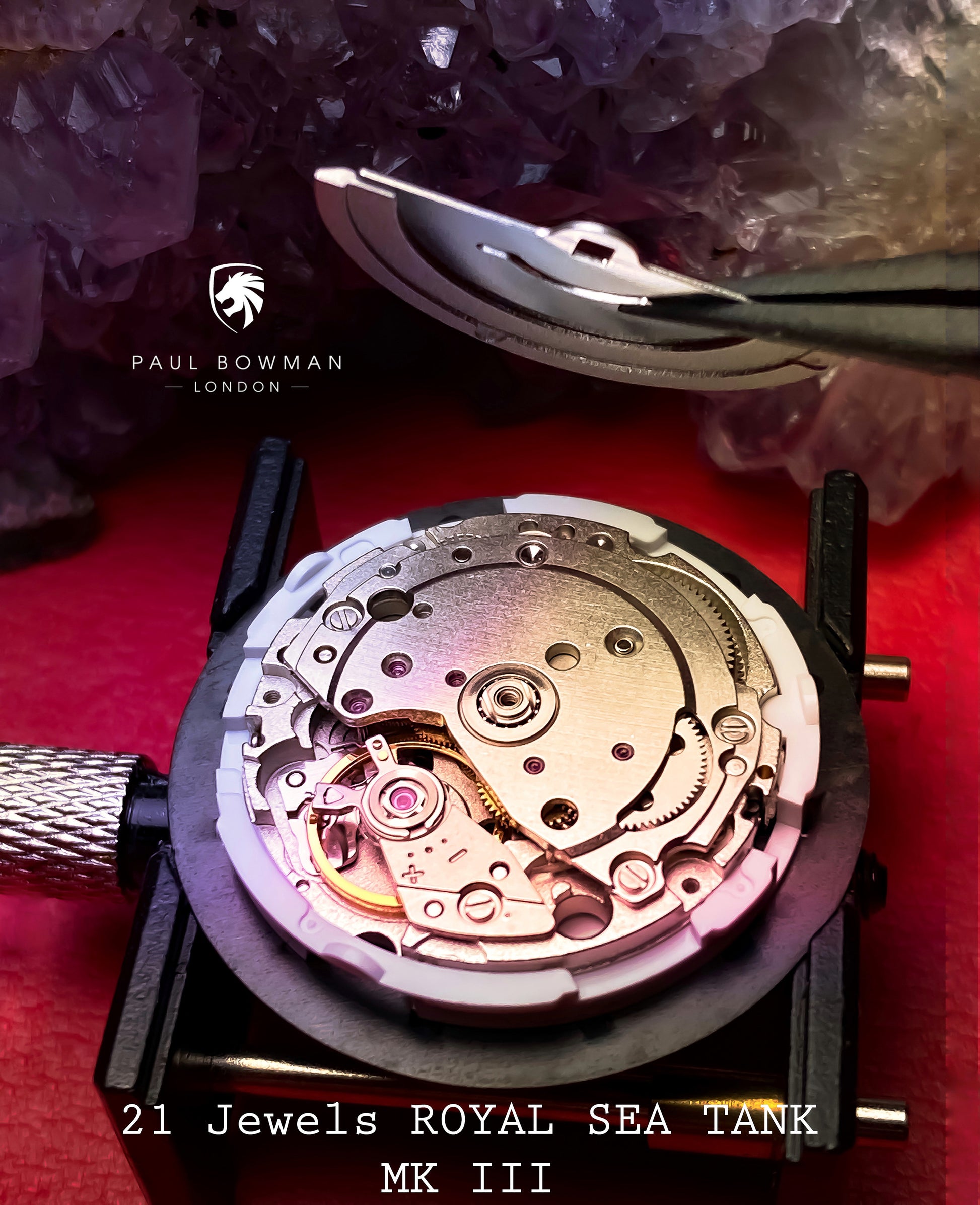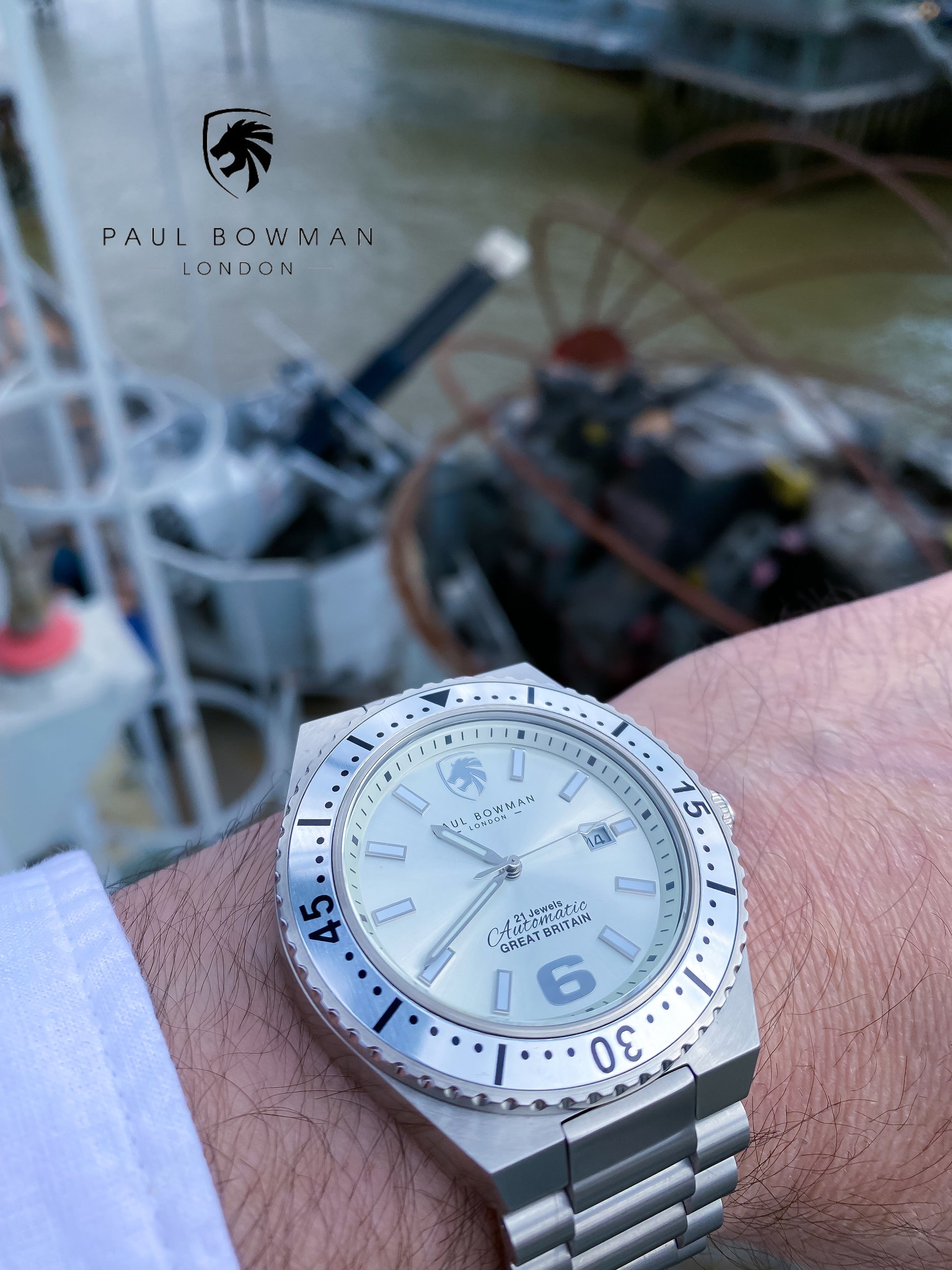 Paul Bowman London proudly introduce its new Maritime range, The Royal Sea Tank MKIII, which is an incredibly tough, robust and very accurate timepiece, heavily built to last. But with all that toughness also comes with exquisite elegance, extremely comfortable, features a Sunburst light grey metallic dial, Sapphire crystal, 21 jewels Japan automatic movement and 200 meters of water resistance, will seat proudly on your wrist with commanding presence inspired on the Royal Navy Viking (BvS10) fully-amphibious vehicle.