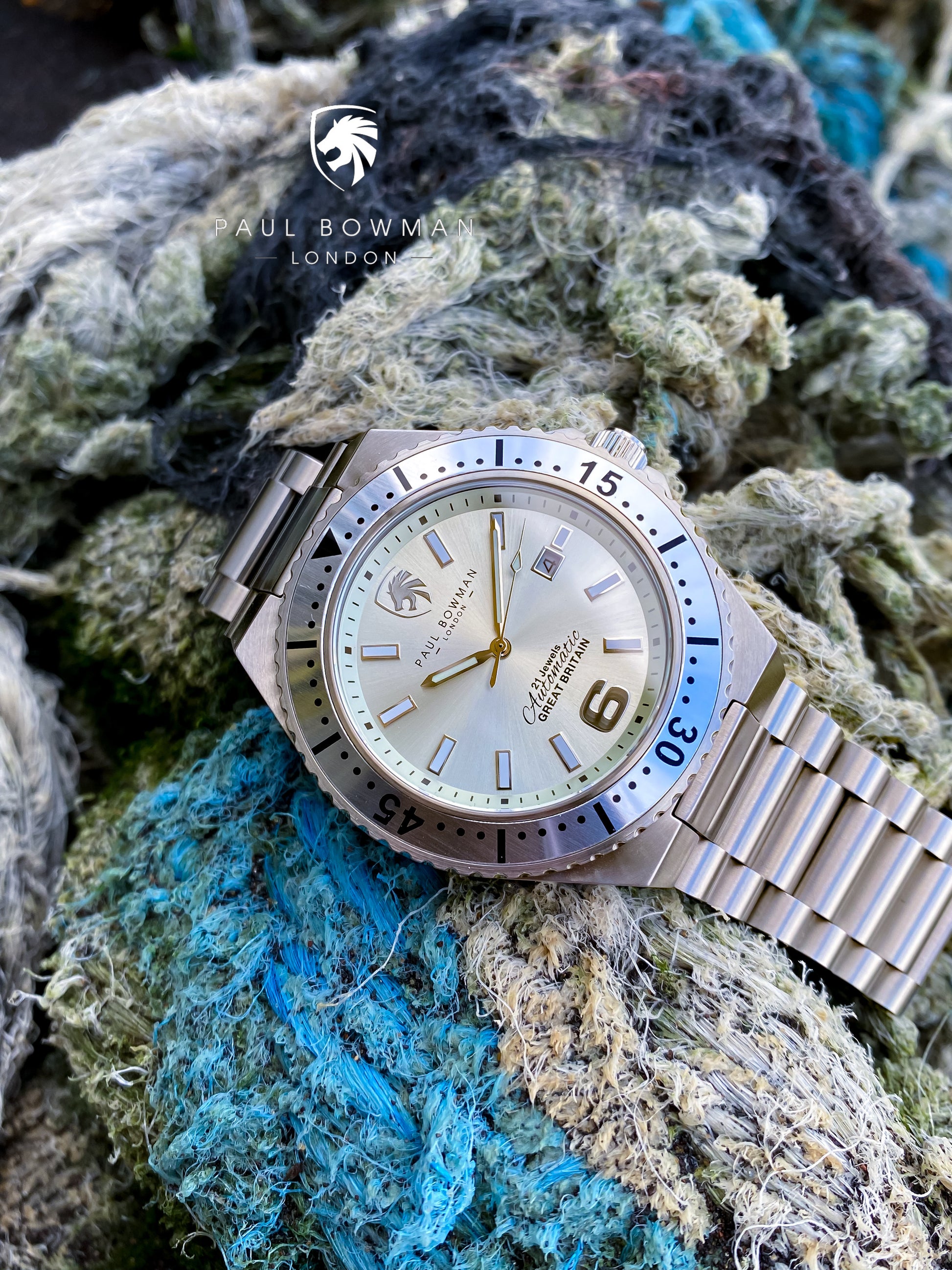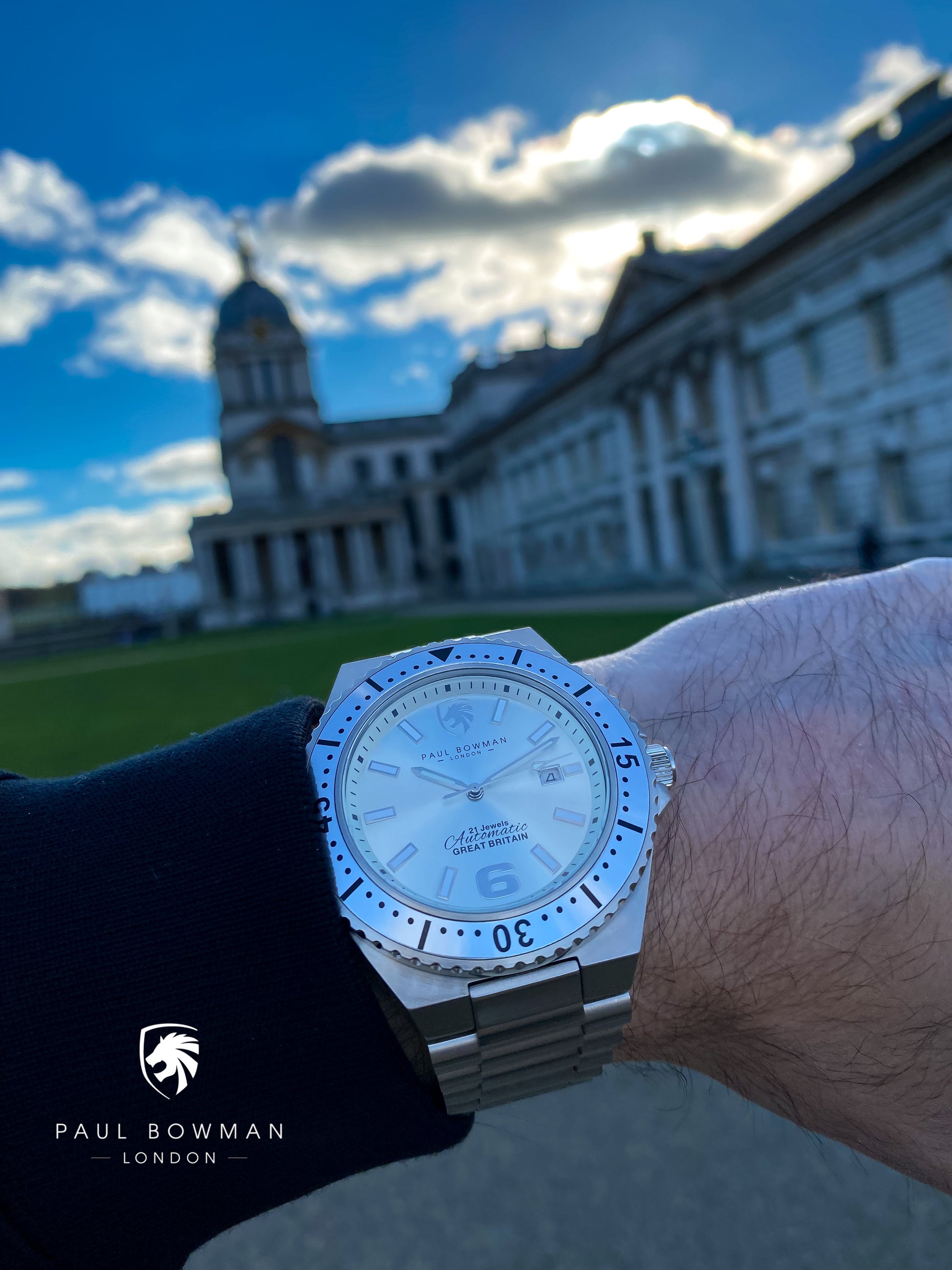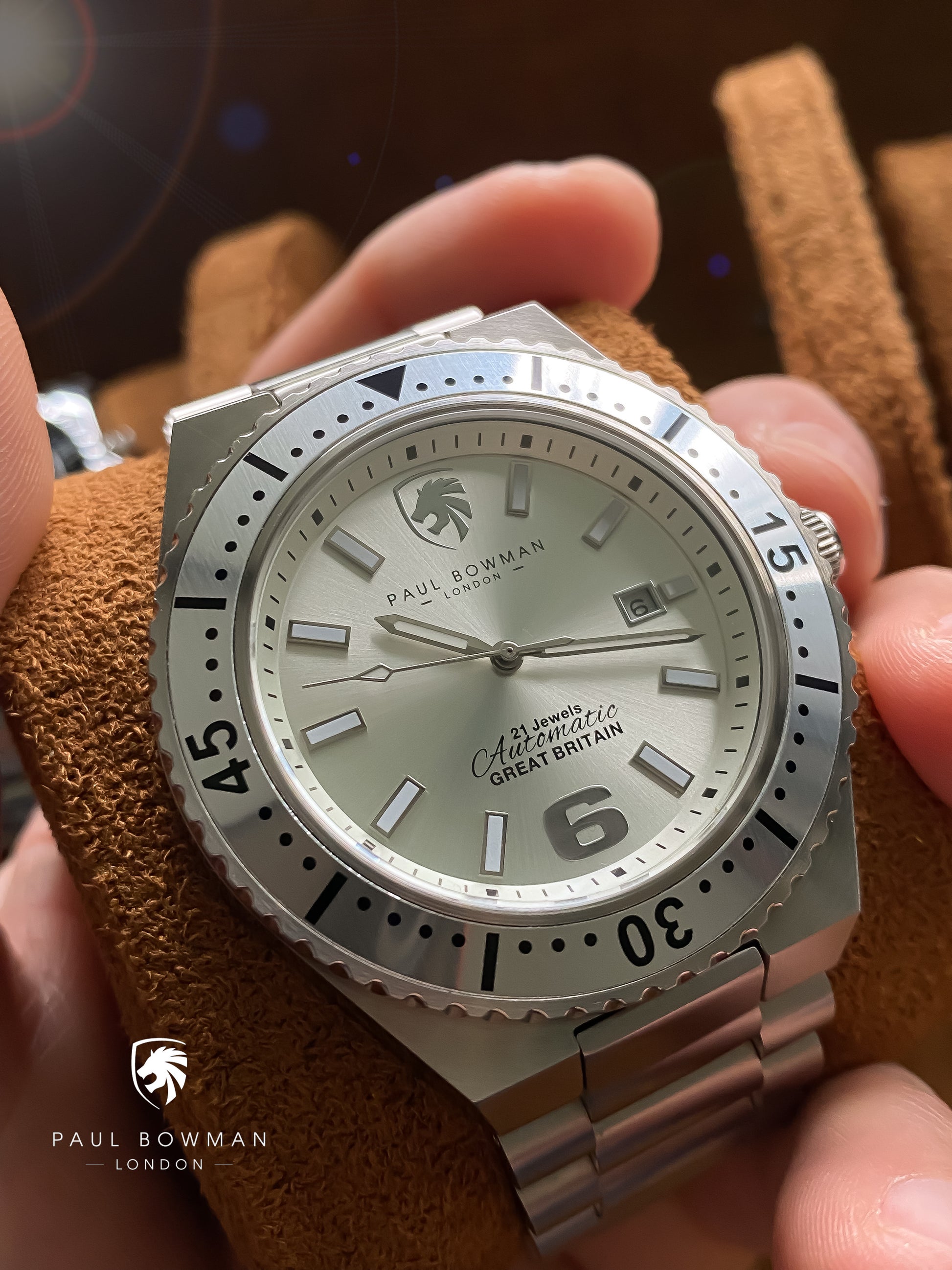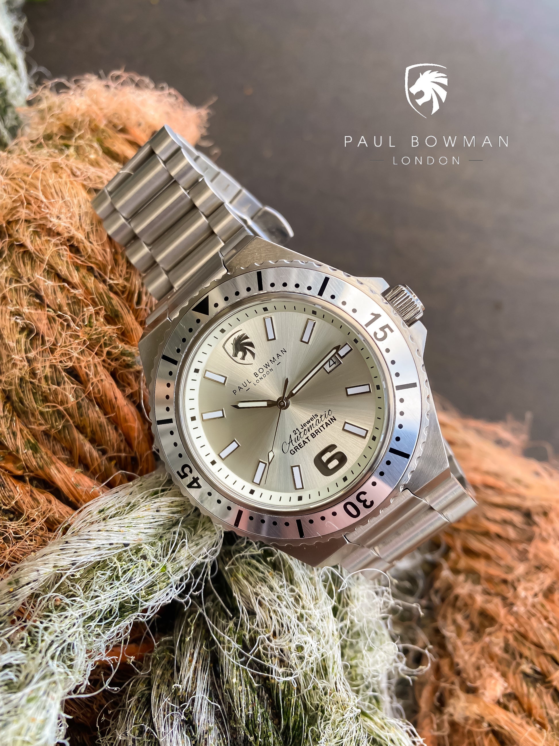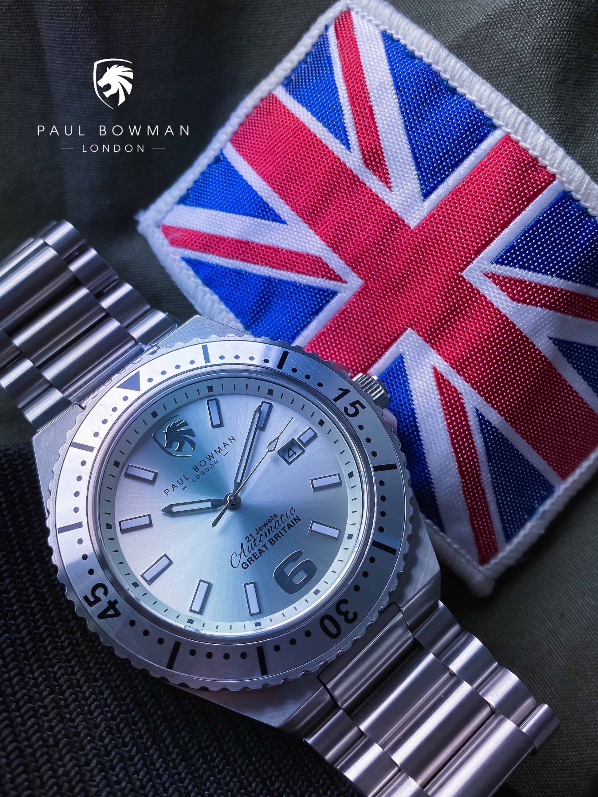 Paul Bowman London proudly introduce its new Maritime range, The Royal Sea Tank MKIII, which is an incredibly tough, robust and very accurate timepiece, heavily built to last. But with all that toughness also comes with exquisite elegance, extremely comfortable, features a Sunburst light grey metallic dial, Sapphire crystal, 21 jewels Japan automatic movement and 200 meters of water resistance, will seat proudly on your wrist with commanding presence inspired on the Royal Navy Viking (BvS10) fully-amphibious vehicle.