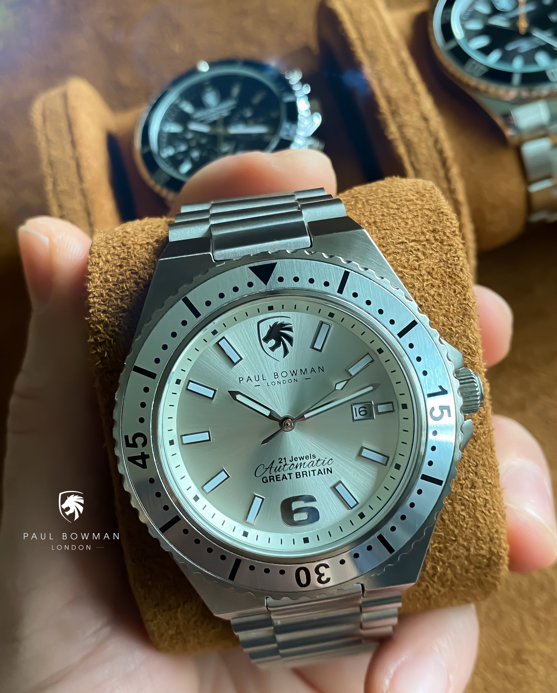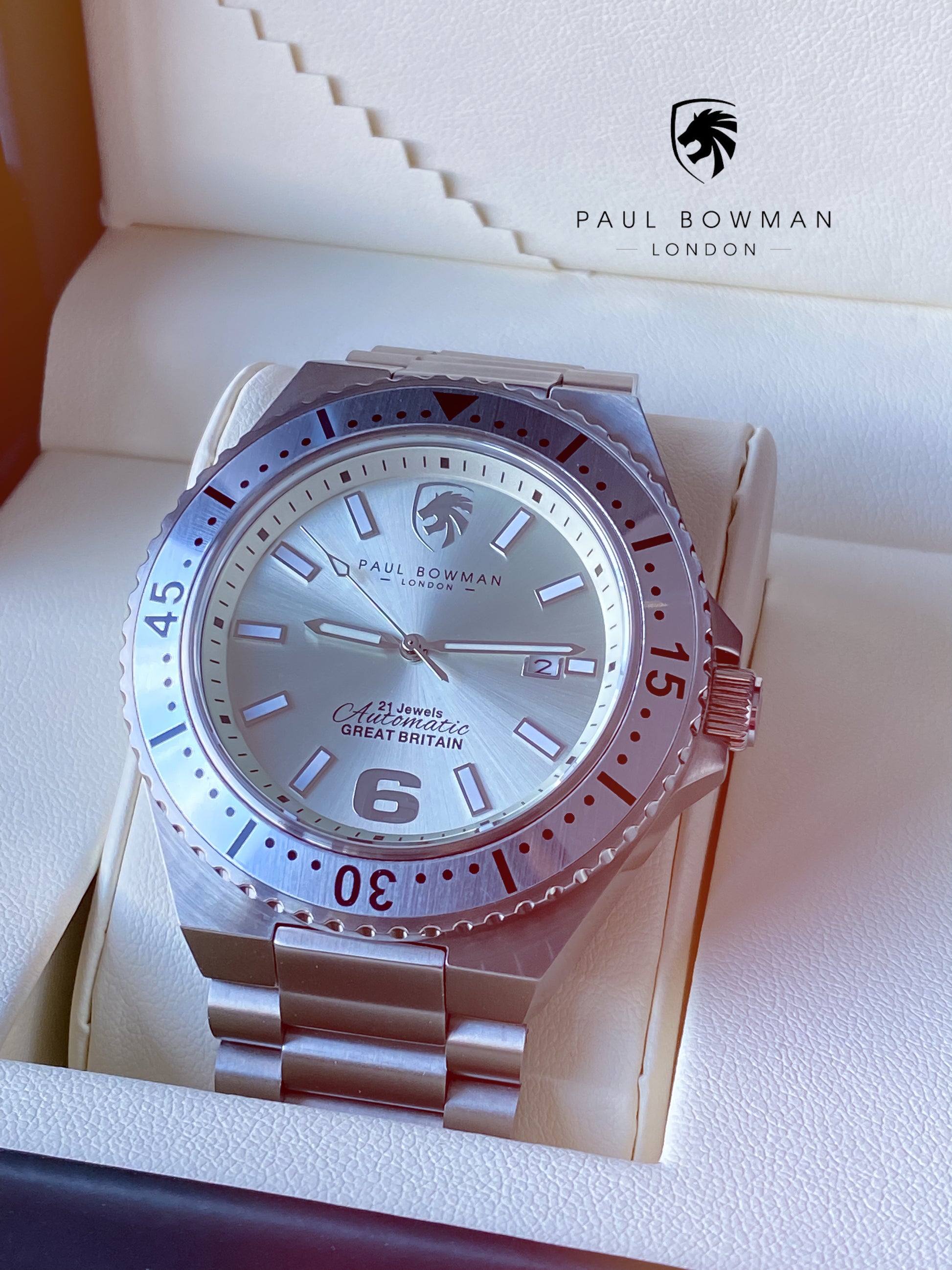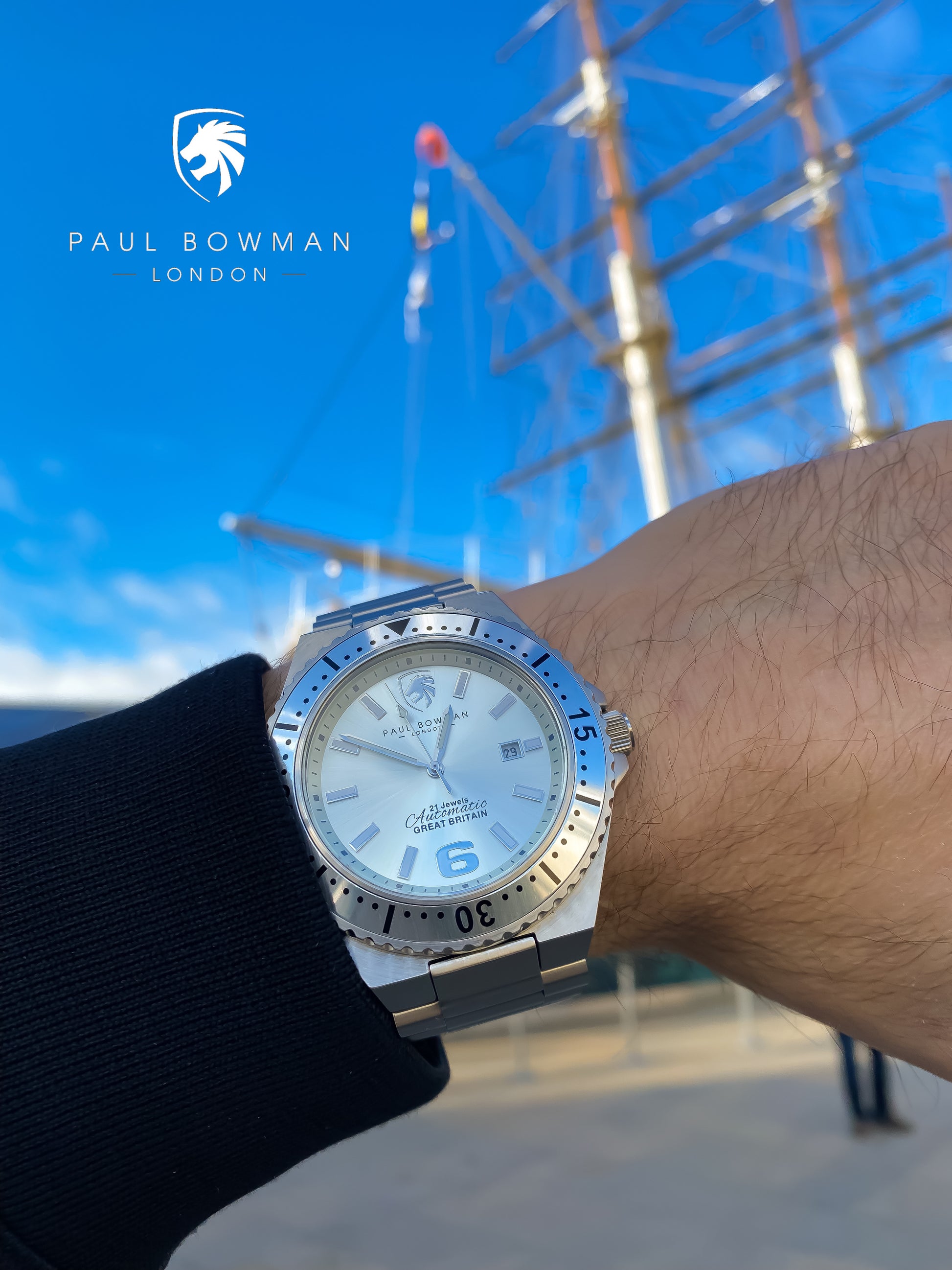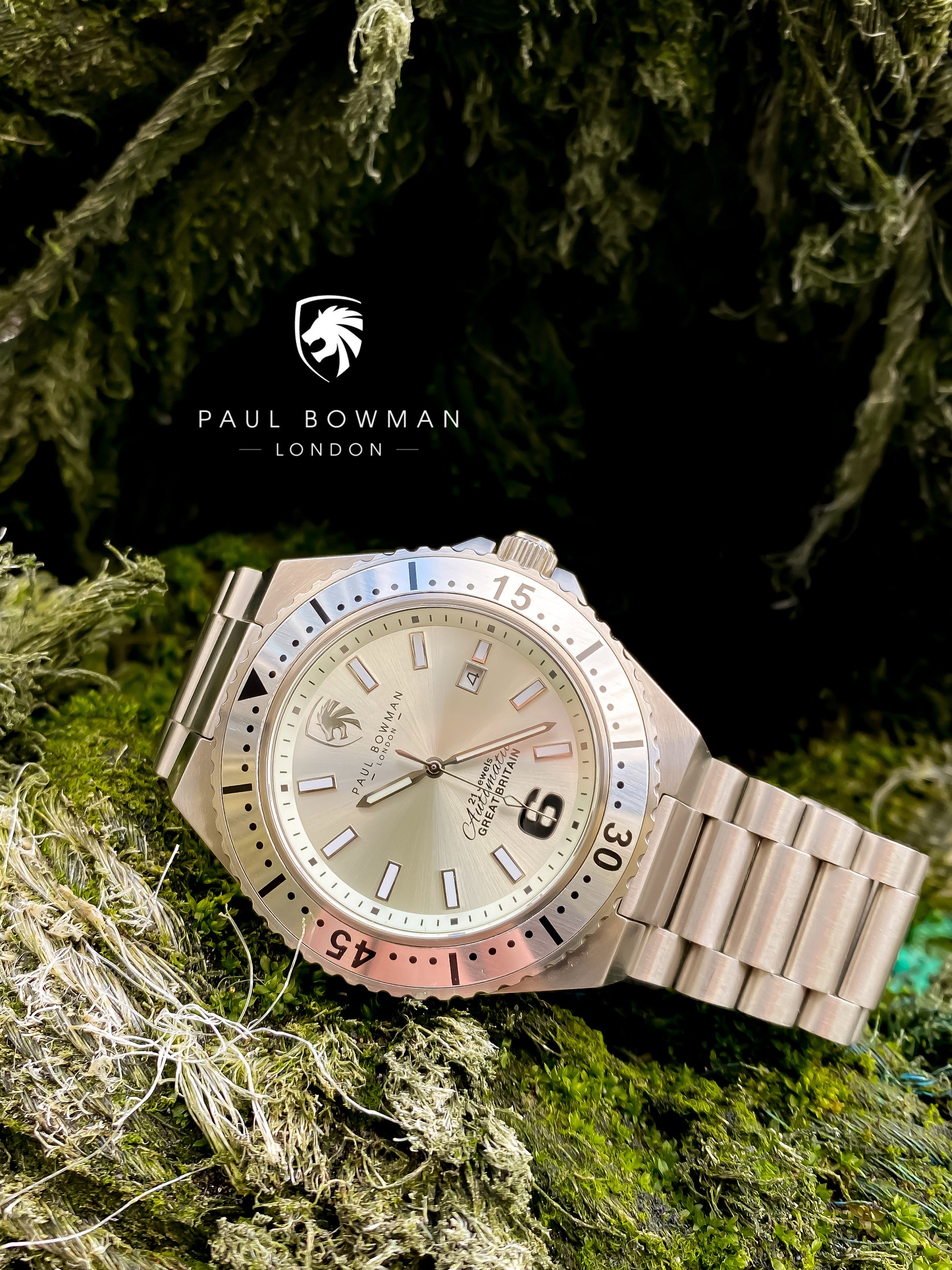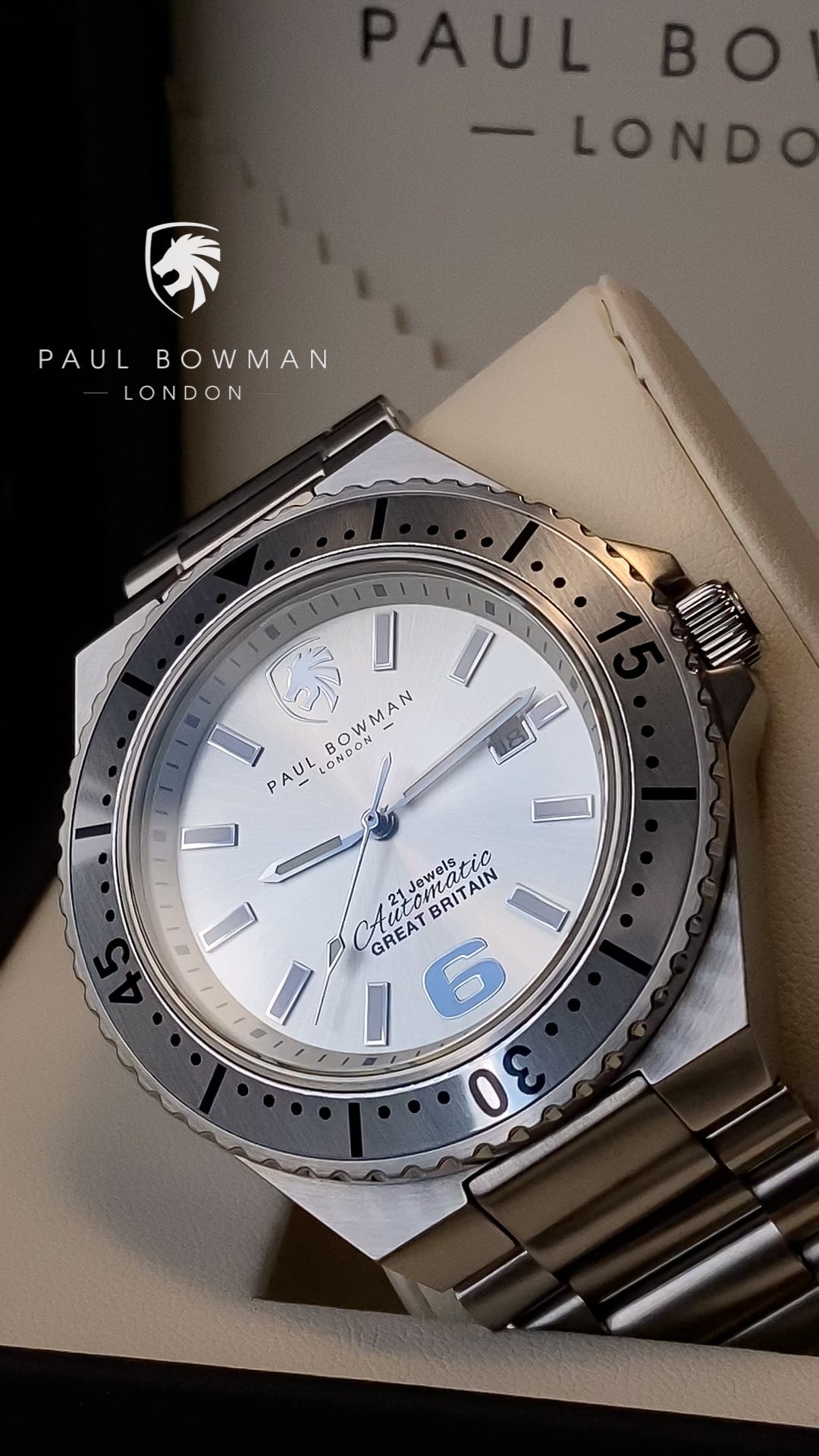 Paul Bowman London proudly introduce its new Maritime range, The Royal Sea Tank MKIII, which is an incredibly tough, robust and very accurate timepiece, heavily built to last. But with all that toughness also comes with exquisite elegance, extremely comfortable, features a Sunburst light grey metallic dial, Sapphire crystal, 21 jewels Japan automatic movement and 200 meters of water resistance, will seat proudly on your wrist with commanding presence inspired on the Royal Navy Viking (BvS10) fully-amphibious vehicle.