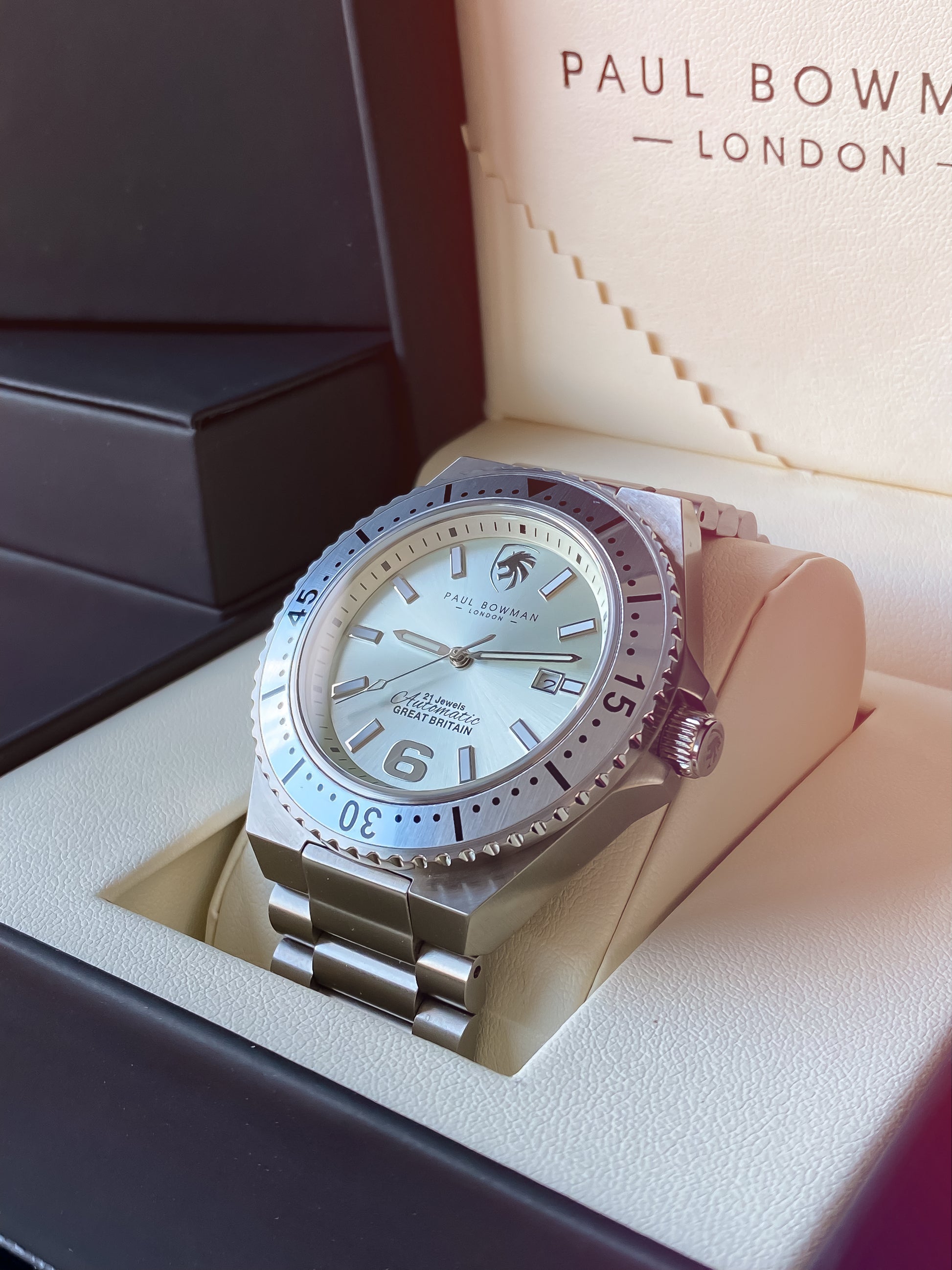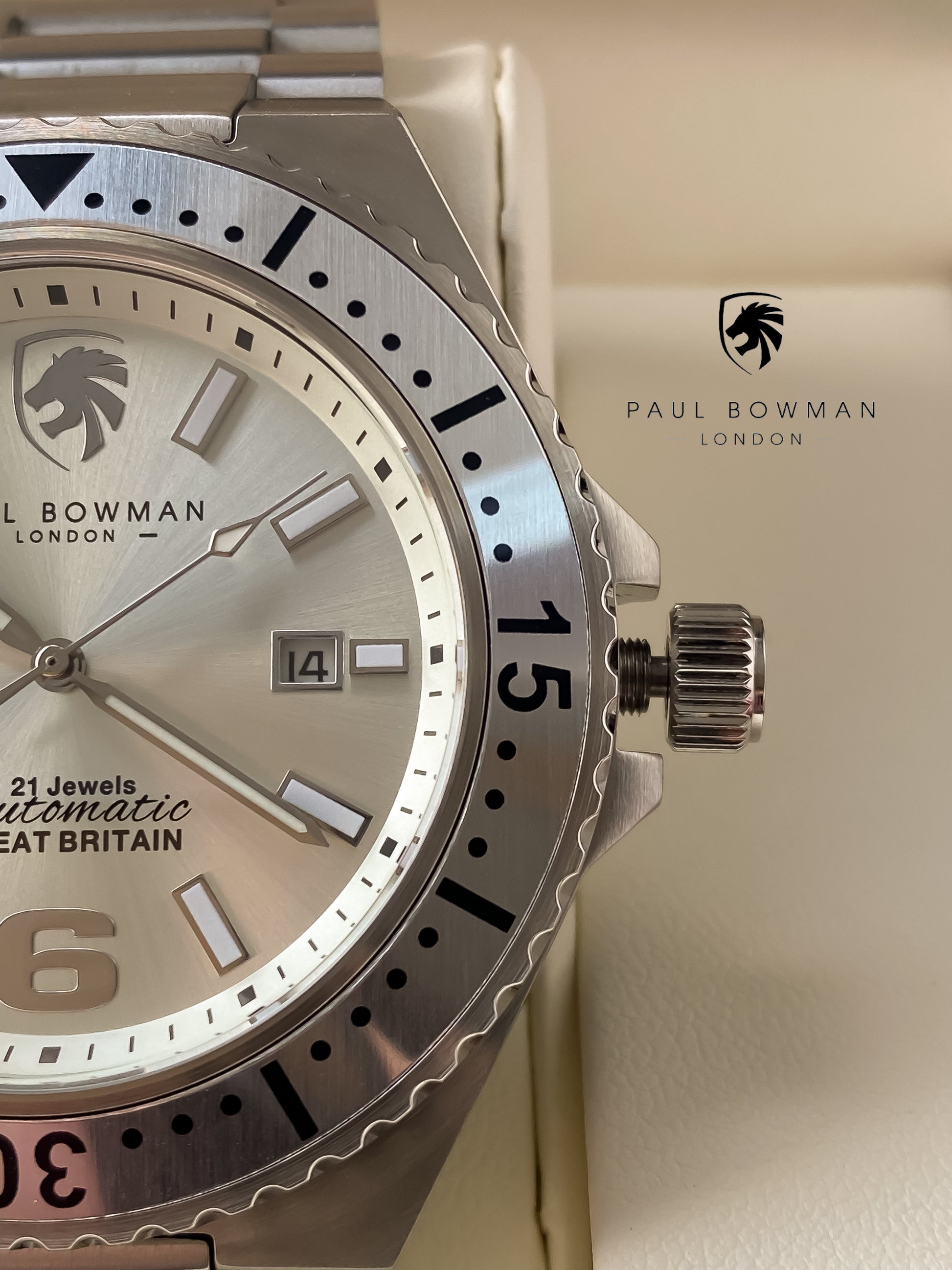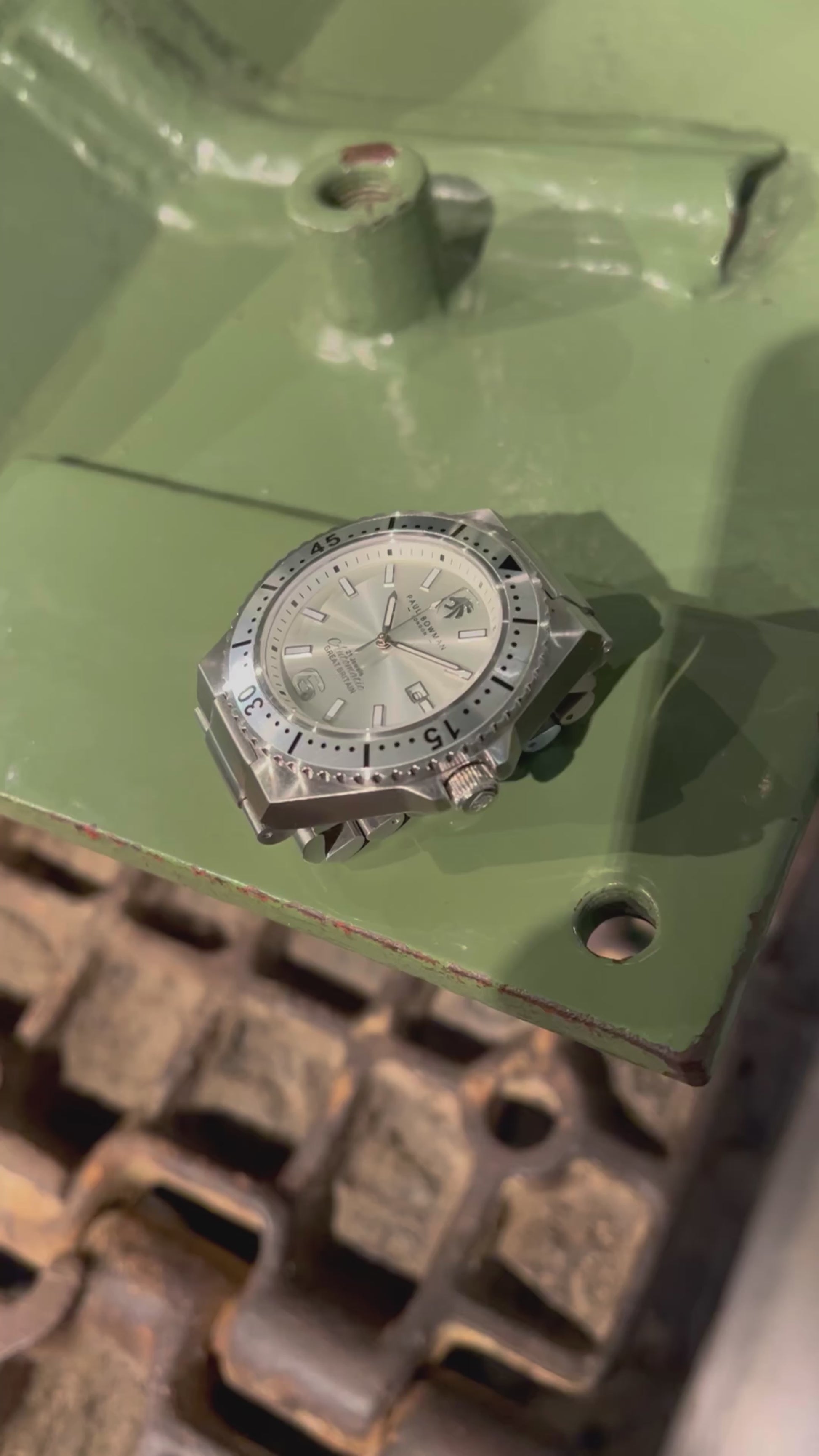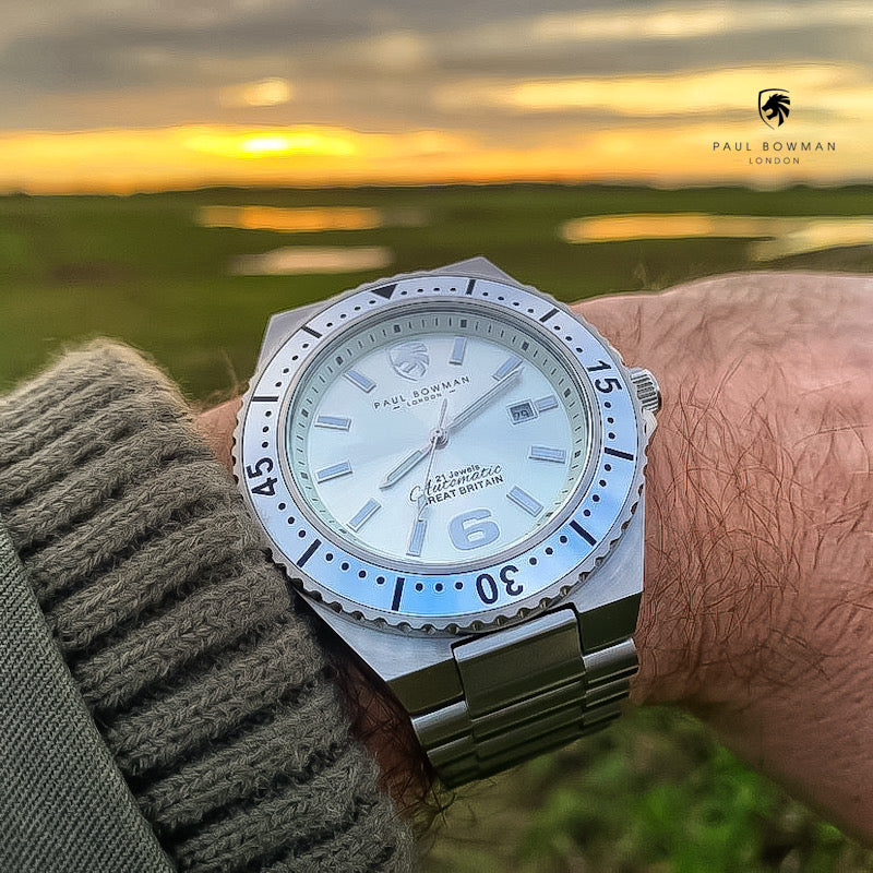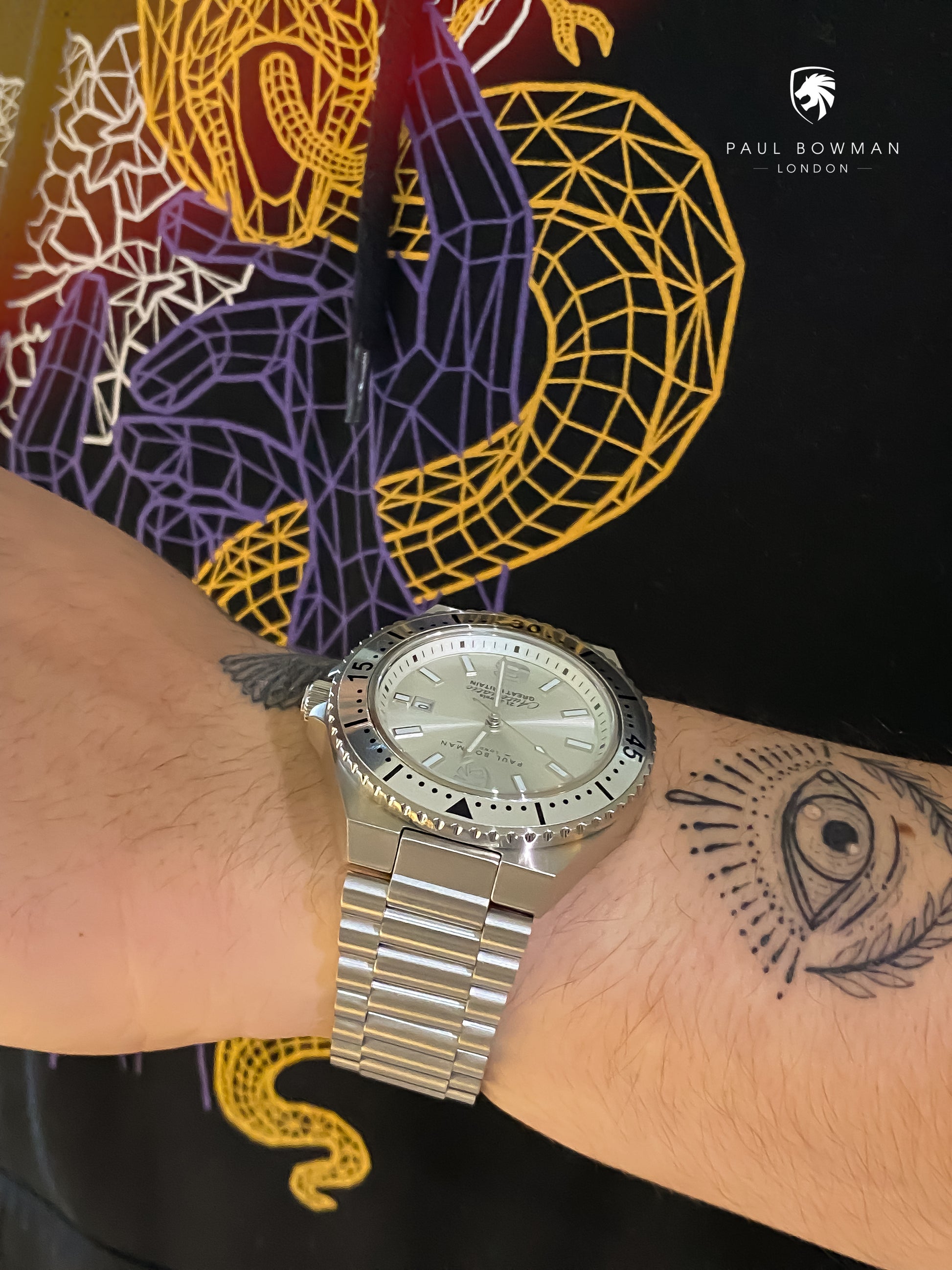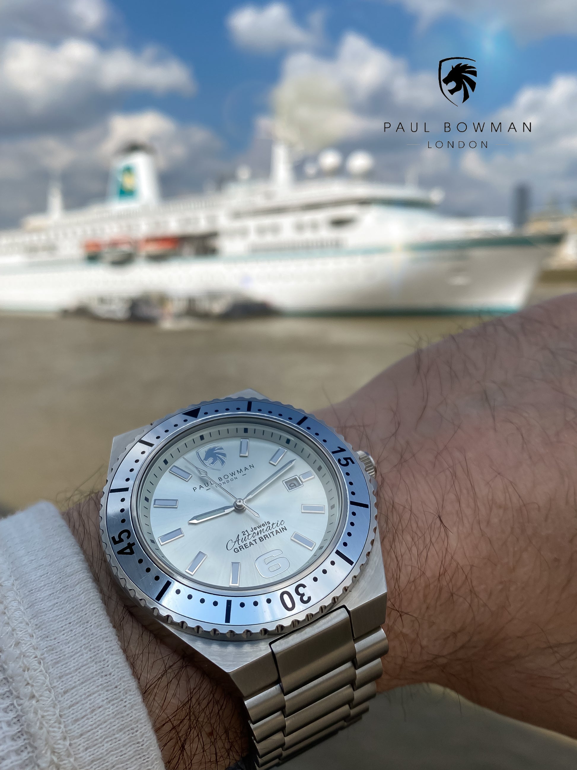 Paul Bowman London proudly introduce its new Maritime range, The Royal Sea Tank MKIII, which is an incredibly tough, robust and very accurate timepiece, heavily built to last. But with all that toughness also comes with exquisite elegance, extremely comfortable, features a Sunburst light grey metallic dial, Sapphire crystal, 21 jewels Japan automatic movement and 200 meters of water resistance, will seat proudly on your wrist with commanding presence inspired on the Royal Navy Viking (BvS10) fully-amphibious vehicle.