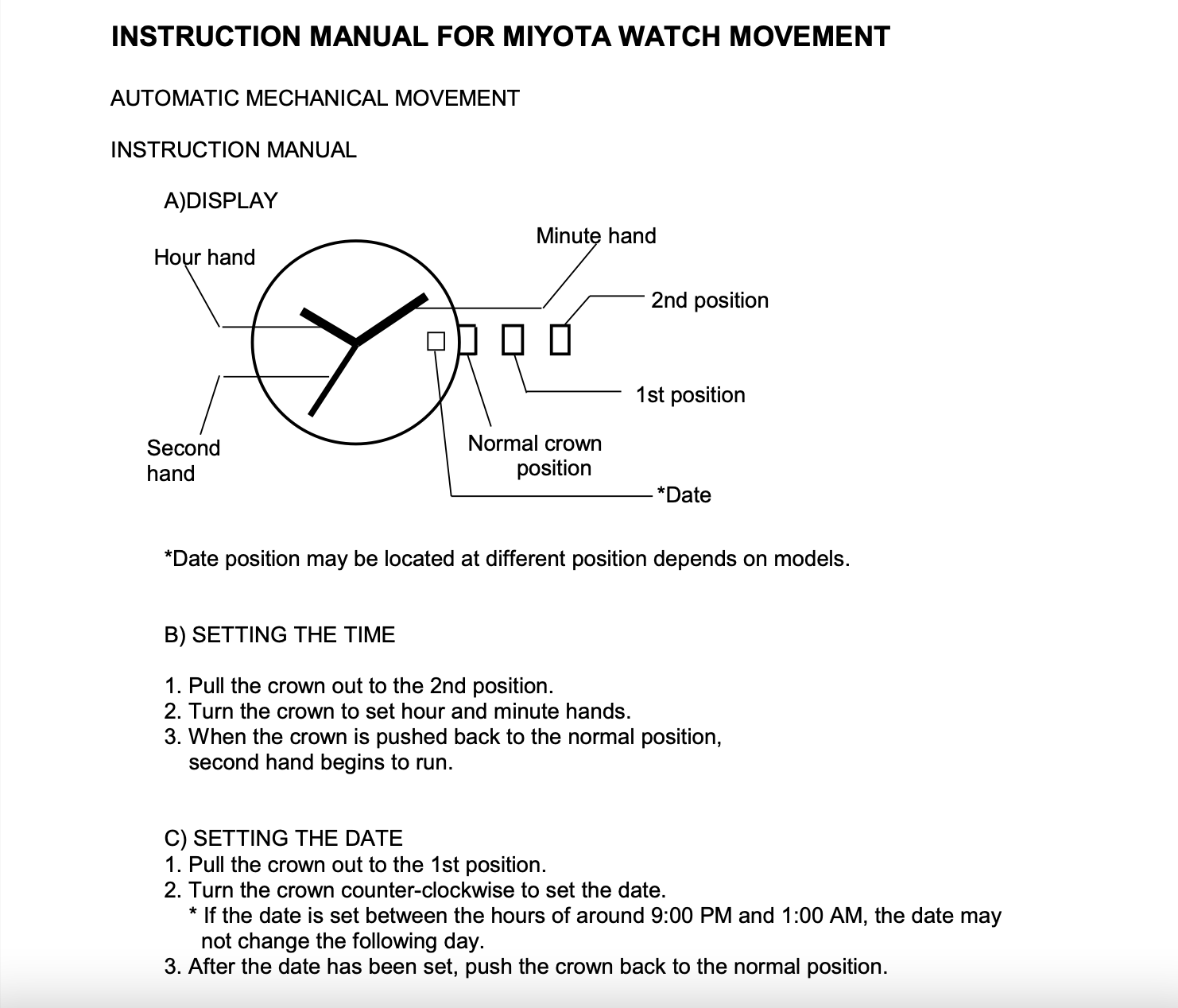 Movement:                  21 Jewels, MIYOTA Calibre 8215, Automatic, Self-winding and hand winding, 42 hours Power reserve, Vibration Frequency 21.600 per hour.